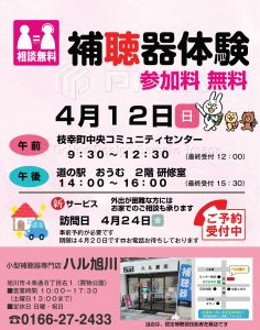 小型補聴器専門店 ハル旭川 です 枝幸町・雄武町 補聴器「相談会」のお知らせです 是非、ご来場ください😊 ★新サービスより 外出が困難な方向けに 🚗訪問も承ります。(☎ 要予約) 🏠訪問日:4月24日(金曜日) ◆相談会日程◆ 📅 4月12日(日曜日) ■ 午 前 🏠 枝幸町中央コミュニティセンター 🕙 9:30 ~ 12:30(最終受付 12:00) 👨 認定補聴器技能者が対応 ■ 午 後 🏠 道の駅 おうむ 2階 研修室 🕙 14:00 ~ 16:00(最終受付 15:30) 👨 認定補聴器技能者が対応